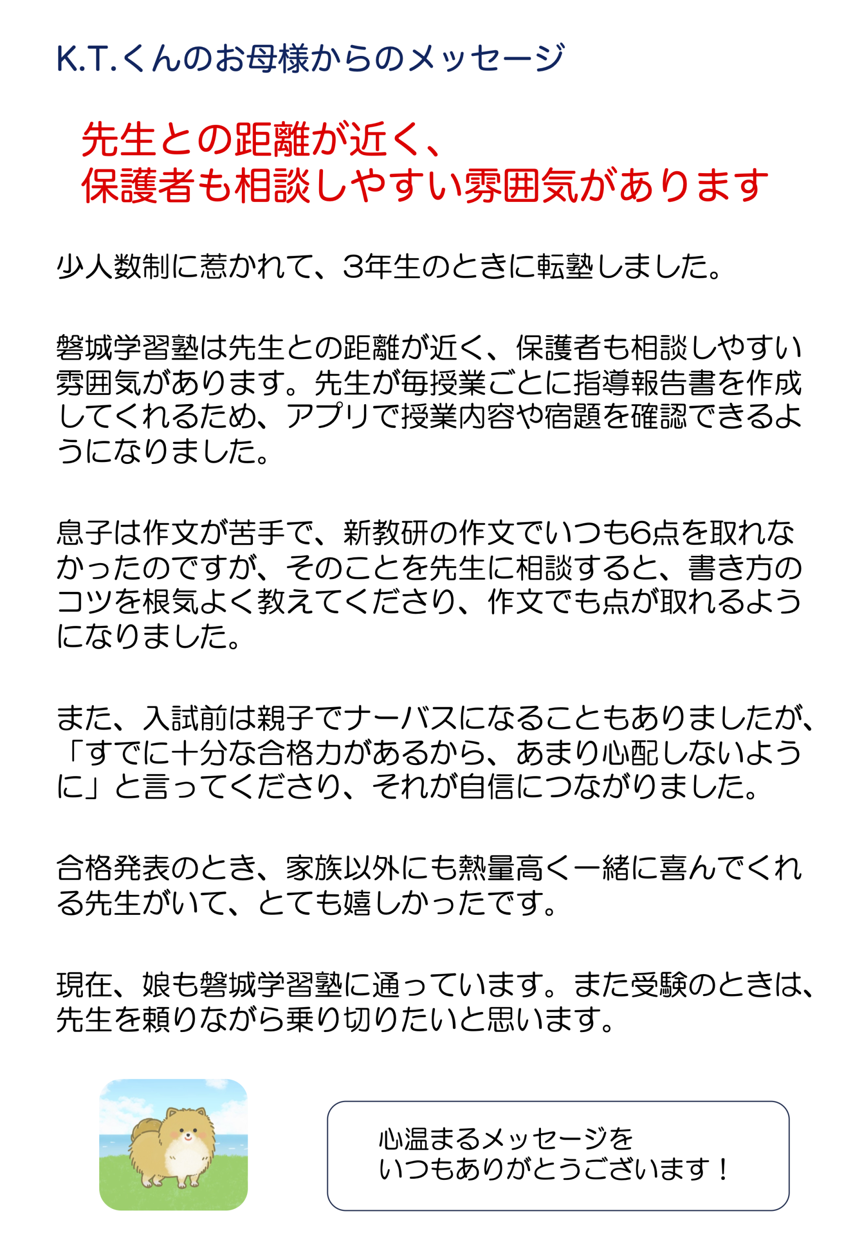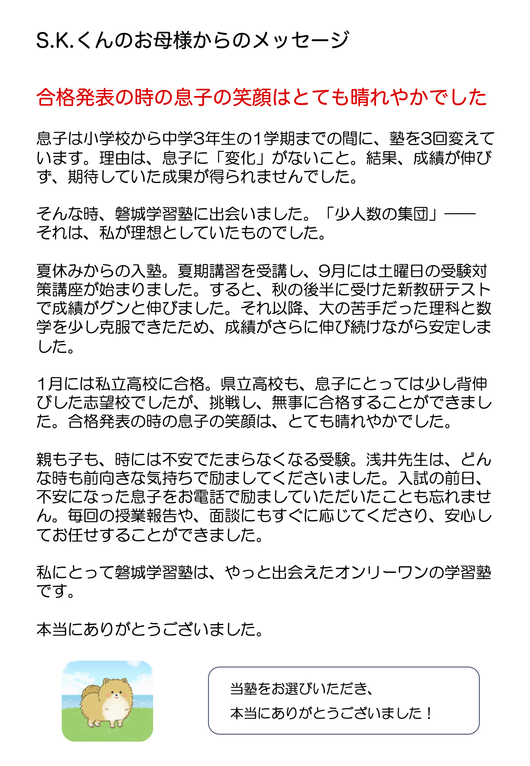 受験を終えた生徒たちの思いと、それを支えた保護者の声をご紹介します。合格までの道のりにあった悩みや努力、喜びの瞬間を、ぜひご覧ください!