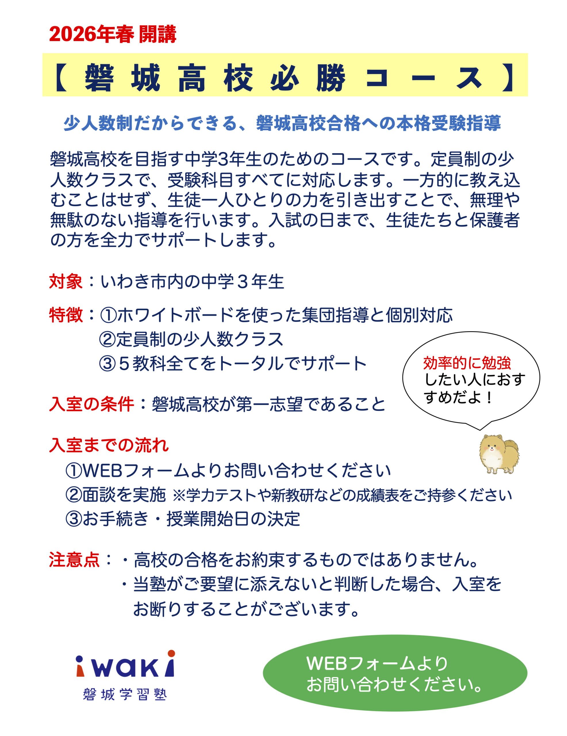 2026年春に開講する、中学3年生を対象とした「磐城高校必勝コース」の概要です。